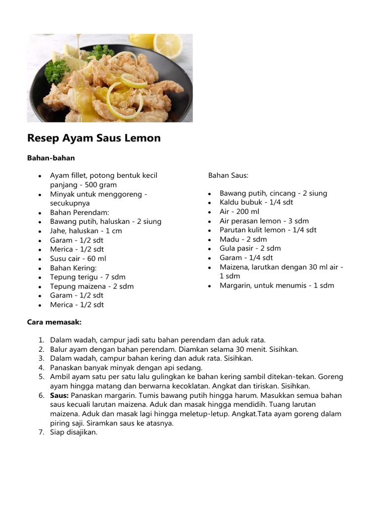 Resep Ayam Saus Lemon Enak Sederhana Dan Cara Membuatnya